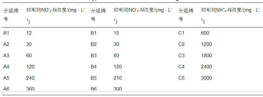 在100 mL血清瓶中加入60 mL配水,pH穩(wěn)定在7.3±0.3,分別向3組血清瓶中加入一定量的NaNO2、NaNO3和NH4Cl貯備液,具體抑制物質(zhì)及濃度情況見表 1.加入40 mL厭氧顆粒污泥,使用高純氮?dú)獯得摷s5 min去除血清瓶中的溶解氧,密封后置于35 ℃恒溫水浴振蕩器中進(jìn)行培養(yǎng),每個(gè)濃度梯度設(shè)3個(gè)平行.