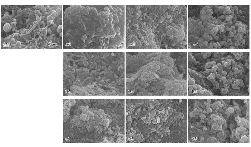 根據(jù)3.1節(jié)中的COD去除率變化選擇具有代表性的濃度組(A組:A2、A4、A6;B組:B2、B4、B6;C組:C1、C3、C5)進(jìn)行各項(xiàng)指標(biāo)的測(cè)定.圖 2為放大10000倍后的顆粒污泥的掃描電鏡圖.由圖 2可見,空白組厭氧顆粒污泥表面幾乎為8~25 μm長(zhǎng)的桿狀菌,伴隨有少量的球菌,污泥表面凹凸不平孔隙交錯(cuò),是內(nèi)部微生物能量代謝的重要通道.在高濃度的亞硝氮、硝氮和氨氮(A6、B6和C5)作用下,厭氧顆粒污泥的表面結(jié)構(gòu)都發(fā)生明顯變化,污泥表面的主要細(xì)菌由桿狀菌變?yōu)榍驙罹?,幾乎不見桿菌.低濃度抑制作用下,污泥表面主要細(xì)菌為桿菌和球狀菌,且與空白組相比桿菌比例明顯降低.