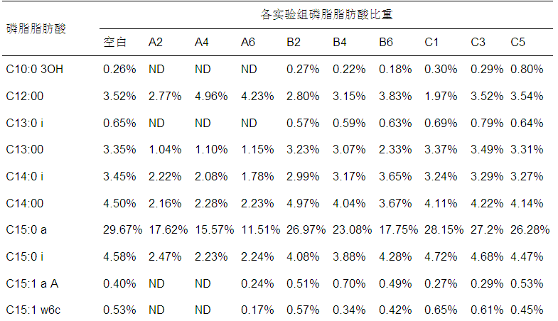 由圖 4可以看出,PC1反映了不同抑制物質(zhì)對(duì)PLFA的影響,PC2反映了不同抑制濃度對(duì)PLFA的影響.主成分分析顯示,各樣品間有較明顯的差異,A2、A4、A6、B6與空白之間的差異度較大,剩余樣品與空白之間的差異度相對(duì)較小.厭氧微生物的PLFA對(duì)亞硝氮的敏感度最高,即使低濃度的亞硝氮(A2)也會(huì)引起PLFA較大的變化;與亞硝氮不同,高濃度硝氮(B6)會(huì)引起PLFA較大變化,而低濃度(B2和B4)下與空白的差異度較小;氨氮(C1、C3和C5)對(duì)厭氧微生物PLFA的影響相對(duì)前兩者較小,且在濃度梯度上變化不大.