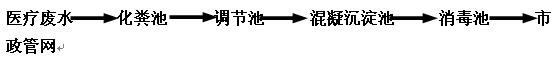 污水由排水系統收集后,進入污水處理站的化糞池,厭氧分解其中的糞便及大分子有機物,然后進入調節(jié)池,進行均質均量,調節(jié)池中設置液位控制器,再經液位控制儀傳遞信號,由提升泵送至混凝沉淀池,加藥絮凝沉淀之后,流入消毒池進行消毒處理,消毒出水直接排入市政管網。