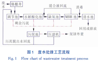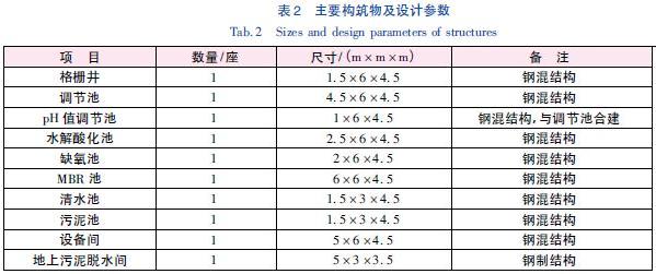 廢水先通過(guò)機(jī)械格柵除去較大的固體懸浮物。從格柵井流出廢水泵入調(diào)節(jié)池,以均勻水質(zhì),緩解水力沖擊負(fù)荷對(duì)后續(xù)工藝的影響。調(diào)節(jié)池出水進(jìn)入水解酸化池,水解酸化池出水依次進(jìn)入缺氧池和MBR 池,缺氧池的主要作用是進(jìn)行反硝化脫氮,從而去除廢水中的氨氮。MBR 集膜的高效分離和生物降解于一體,是將污水生物處理技術(shù)與膜分離技術(shù)相結(jié)合的新型污水處理工藝。其用膜組件代替了傳統(tǒng)活性污泥工藝中的二沉池,可進(jìn)行高效固液分離,達(dá)到水凈化的目的,克服了傳統(tǒng)工藝中出水水質(zhì)欠穩(wěn)定、污泥易膨脹等不足。生物反應(yīng)器內(nèi)保持較高的污泥濃度,硝化能力強(qiáng),污染物去除率高,部分混合液回流至缺氧池進(jìn)行反硝化去除氨氮。MBR 池出水進(jìn)入到清水池進(jìn)行消毒后,出水可回用或達(dá)標(biāo)排放。主要構(gòu)筑物尺寸及設(shè)計(jì)參數(shù)見表2。