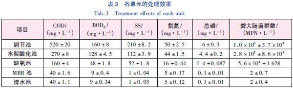調(diào)試運(yùn)行結(jié)束后,出水水質(zhì)基本穩(wěn)定,各項(xiàng)污染物指標(biāo)均達(dá)到排放標(biāo)準(zhǔn),具體處理效果見表3 (表內(nèi)數(shù)據(jù)為連續(xù)5 d 監(jiān)測(cè)結(jié)果平均值±單倍標(biāo)準(zhǔn)偏差) 。