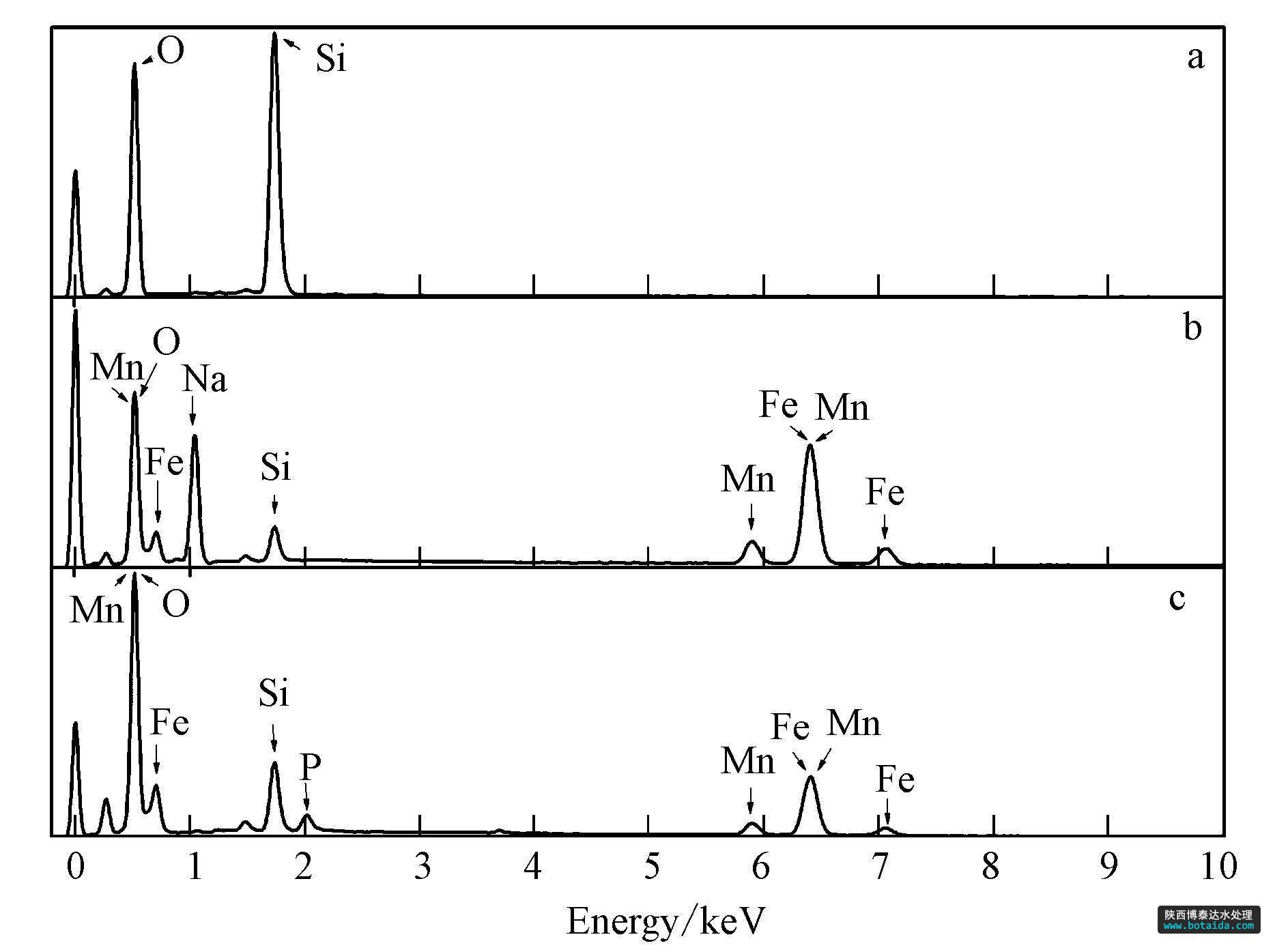 海砂與包覆海砂磷吸附前后的EDAX圖譜如圖 2所示. 海砂以硅元素與氧元素為主要成分,包覆鐵錳復(fù)合氧化物后,出現(xiàn)了明顯的鐵元素與錳元素的特征峰,表明鐵錳復(fù)合氧化物包覆在海砂的表面. 吸附磷后包覆海砂的EDAX圖譜又出現(xiàn)了磷元素的特征峰,表明鐵錳復(fù)合氧化物包覆海砂對(duì)溶液中的磷具有吸附性能.