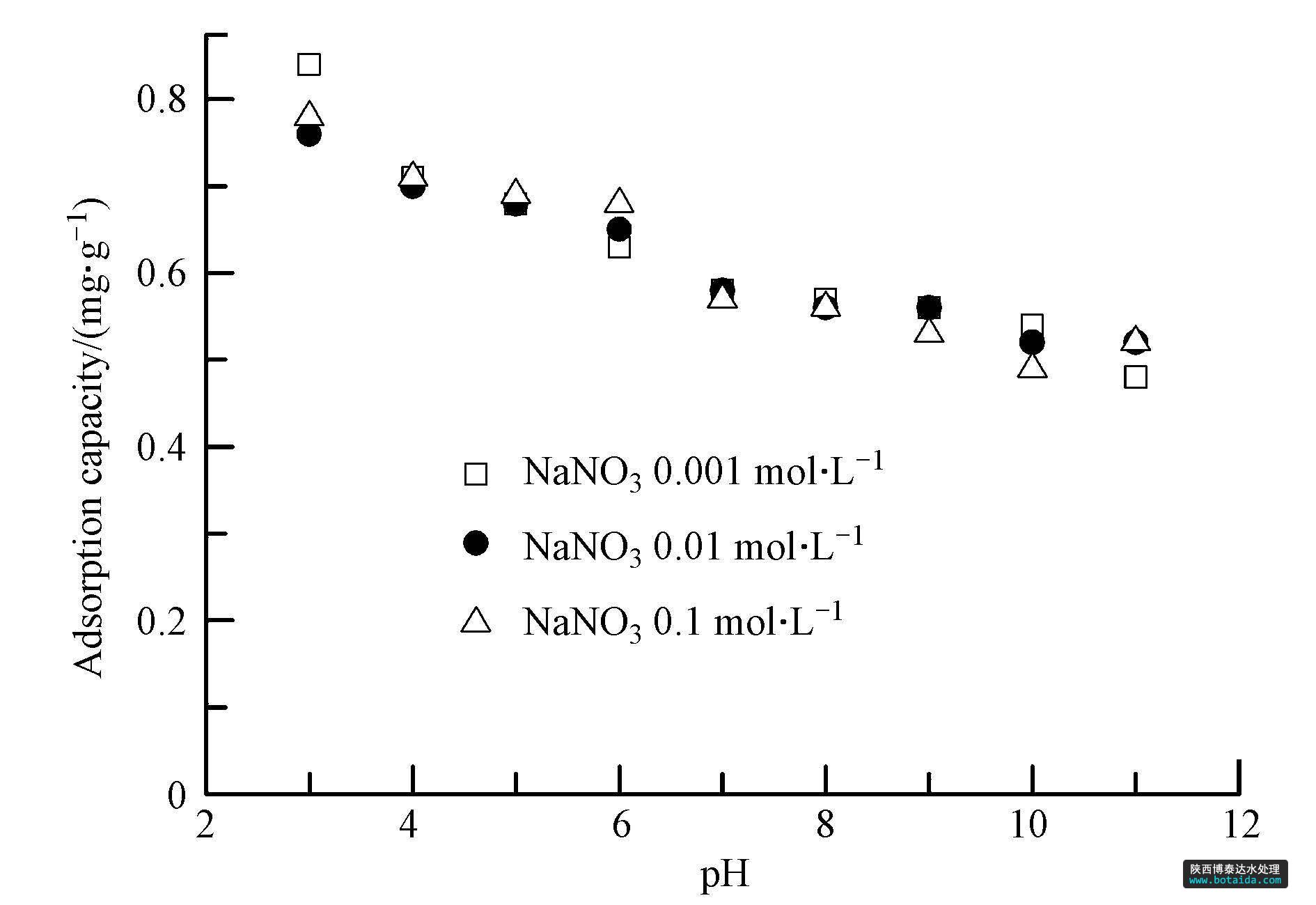 配制一系列50 mL濃度為5.0 mg · L-1磷溶液,分別投加200 mg吸附劑,考察不同pH(3.0~11.0)和不同離子強(qiáng)度(0.1 mol · L-1,0.01 mol · L-1,0.001 mol · L-1 NaNO3)對(duì)吸附磷的影響. 用HNO3和NaOH調(diào)節(jié)溶液pH,使pH穩(wěn)定在不同預(yù)定值.
