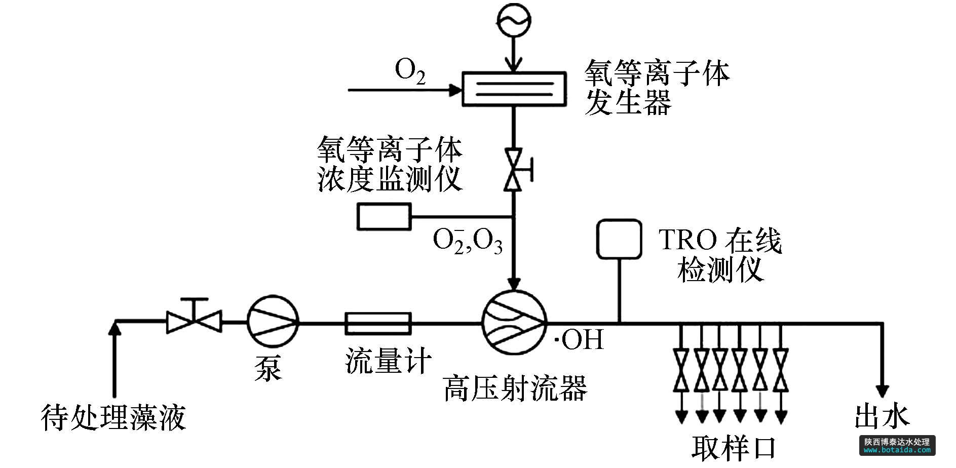 · OH處理高藻水的實(shí)驗(yàn)系統(tǒng)如圖 1所示.待處理藻液由水泵泵入管路,進(jìn)水流量為4 L · min2-1,純度為99.9%的O2通入氧等離子體發(fā)生器中(圖 2),流量為0.5 L · min-1.在大氣壓下微流注與微輝光交替協(xié)同形成的強(qiáng)電離放電作用下,O2被電離,生成O+、O(21D)、O、O-、O2(a21Δg)、O3等氧活性粒子;然后在高壓射流器處,經(jīng)射流、空穴作用將氣態(tài)氧活性粒子高效傳質(zhì)混溶于水溶液中,生成以· OH為主的氧自由基溶液,其中還包括H2O2、HO-、O2· -,