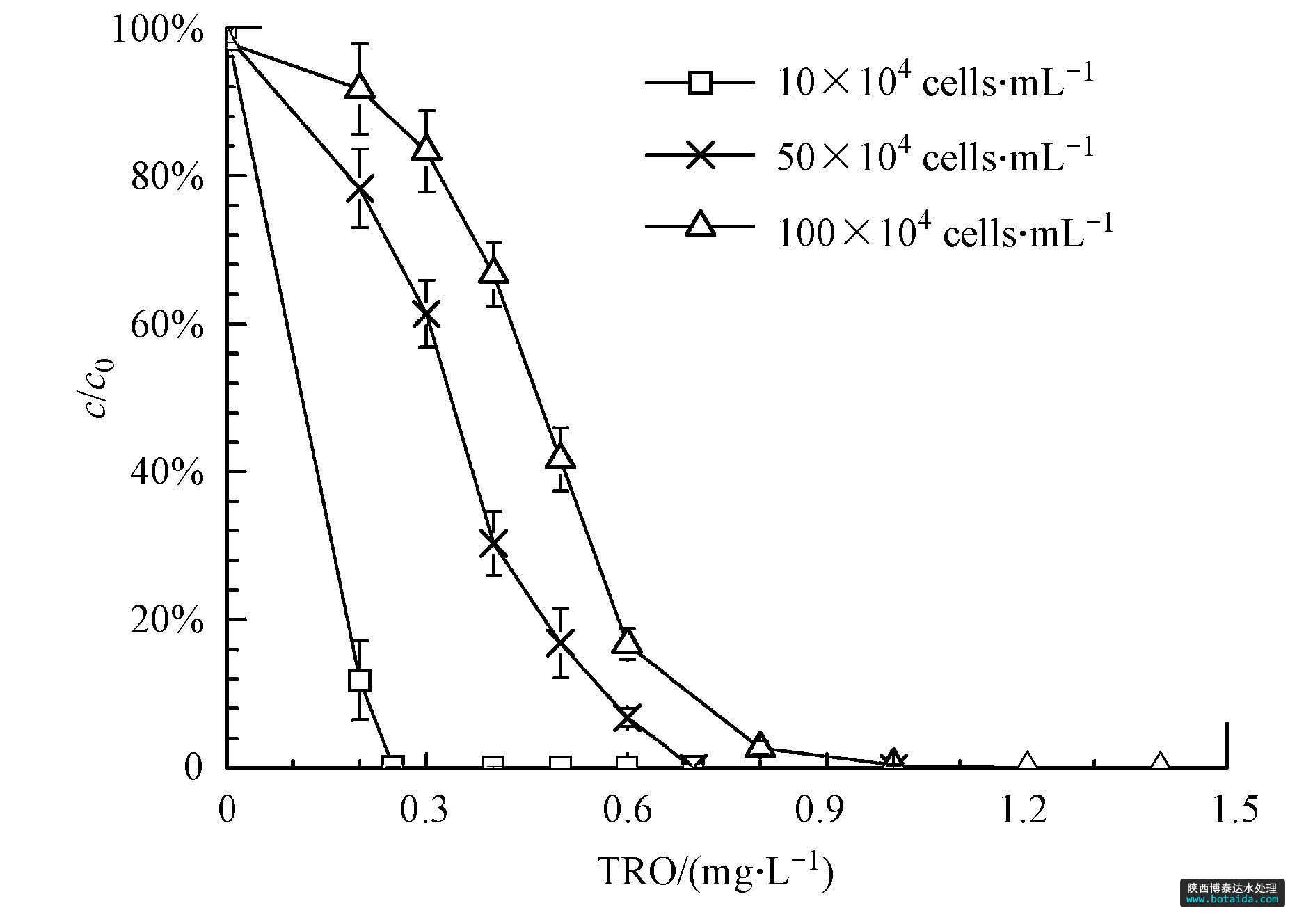 實(shí)驗(yàn)中對初始藻密度分別為10×104、50×104、100×104 cells · mL-1的藻液在實(shí)驗(yàn)系統(tǒng)中進(jìn)行殺滅.對于某一藻密度的藻液,改變TRO濃度,利用熒光顯微鏡測定藻細(xì)胞的存活率(c/c0).得到不同初始藻密度的藻細(xì)胞存活率與TRO濃度的關(guān)系曲線,如圖 3所示.可看出,隨著TRO濃度的不斷升高,藻細(xì)胞存活率隨之降低;在相同的TRO濃度下,藻類的初始濃度越高,存活率越低.因此使不同的初始藻密度的藻細(xì)胞完全致死所需的TRO濃度是不同的.隨著藻液初始藻密度的升高,所需要的致死劑量也隨之升高.致死劑量由低到高分別為0.25、0.71、1.18 mg · L-1.