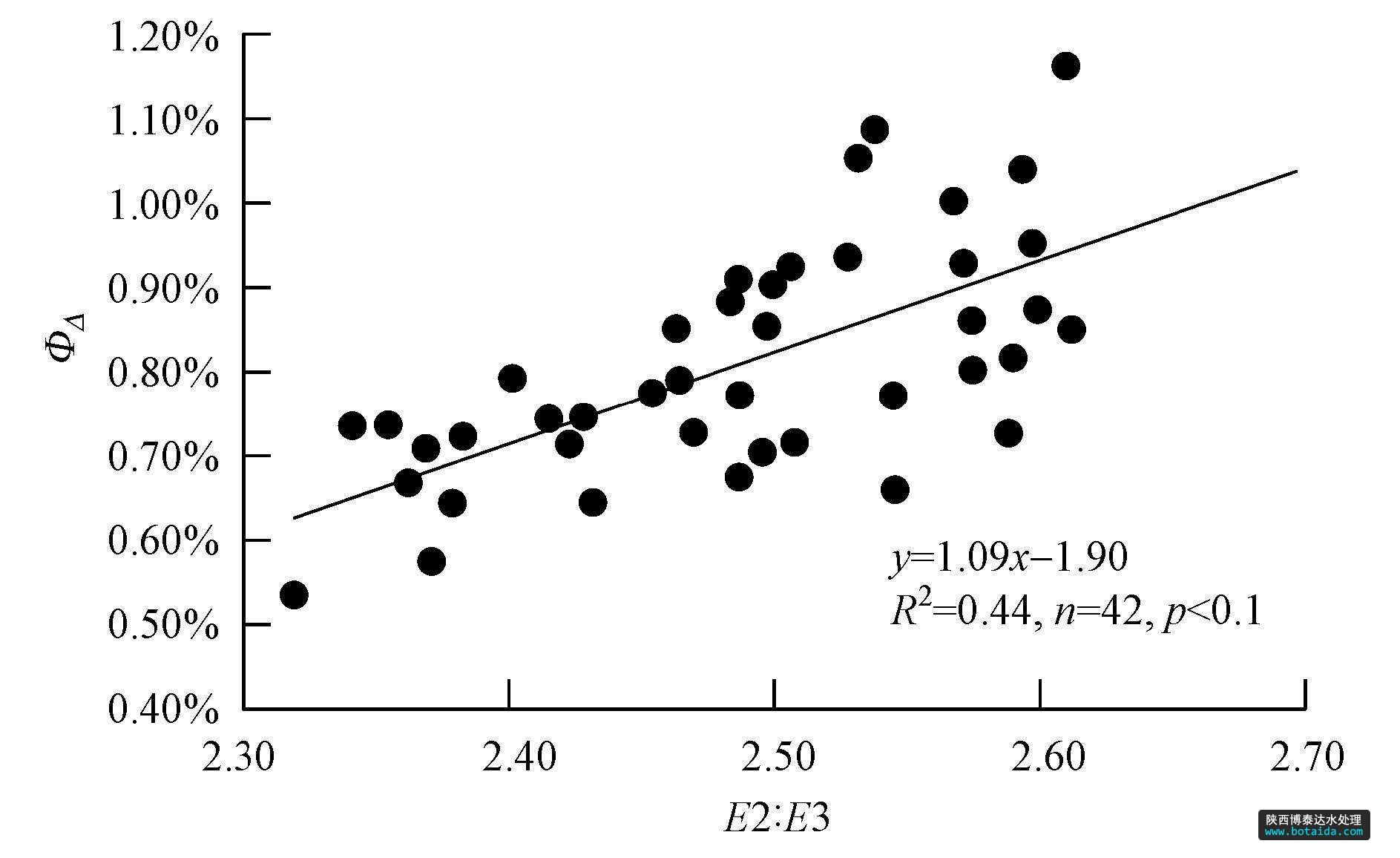 盡管腐殖酸結(jié)構(gòu)、性質(zhì)的復(fù)雜性對其分子規(guī)模下光化學(xué)模型的建立造成了很大阻礙,但眾多研究表明了用光譜數(shù)據(jù)對腐殖酸光化學(xué)反應(yīng)速率進(jìn)行預(yù)測的可能性.例如,一些研究結(jié)果表明:熒光特性指標(biāo)與DOM的平均分子量負(fù)相關(guān)(Coelho et al., 2011),小分子量的HA光敏化降解2,4,6-三甲基苯酚的效率比大分子量的高(Halladja et al., 2007).Dalrymple et al., 2010)用測定得到的ФΔ與E2:E3的關(guān)系式對ФΔ進(jìn)行預(yù)測計(jì)算,結(jié)果與實(shí)際值的誤差為-3%~60%.