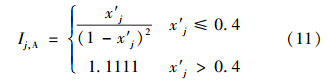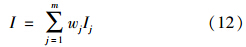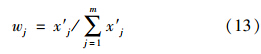 式中,Ij為由式(10)或式(11)計(jì)算得到的指標(biāo)j的引力指數(shù)值;wj為指標(biāo)j的歸一化權(quán)值,即滿足∑ m j=1 wj=1,它可以視實(shí)際問題需要,采用某種方法確定.一般情況下,只要各指標(biāo)的規(guī)范值x′j差異不大,可視各指標(biāo)為等權(quán)即可;但若最大指標(biāo)規(guī)范值x′j,max與最小指標(biāo)規(guī)范值x′j,min差異較大,則可采用如式(13)所示的對各指標(biāo)規(guī)范值x′j的線性加權(quán)計(jì)算權(quán)值.