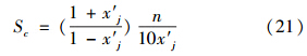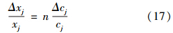 若n固定,將Sc對x′j求導(dǎo),并令S′c=0,得x′j=-1≈0.4142時(shí),Sc有極小值0.5828n.由于變換式(2)~(7)中,對多數(shù)指標(biāo)只取n=±2、±1、±0.5.而公式(10)和式(11)中,x′j 取值范圍為x′j∈[0,0.5](對水體),x′j∈[0,0.4](對空氣).當(dāng)n為上述值時(shí),x′j 分別取為如表 4所示值時(shí),由式(21)計(jì)算得靈敏度Sc值如表 4所示.