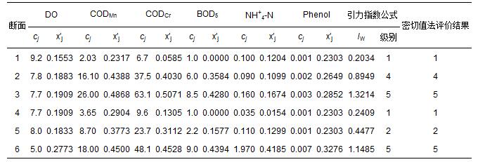 2008年圖們江干流6個(gè)斷面的6項(xiàng)地表水水質(zhì)指標(biāo)監(jiān)測數(shù)據(jù)cj(唐立新等,2010),以及由式(1)和式(2)計(jì)算得到的指標(biāo)規(guī)范值x′j如表 5所示.對斷面2和3,采用式(13)對引力指數(shù)值進(jìn)行加權(quán)計(jì)算;其余斷面在視指標(biāo)為等權(quán)的情況下,用式(10)和式(12)計(jì)算得到各監(jiān)測點(diǎn)水質(zhì)引力綜合指數(shù)值,并根據(jù)表 3中3類陸地水體的引力綜合指數(shù)值的分級標(biāo)準(zhǔn)做出水質(zhì)類別判斷結(jié)果(表 5).表 5中還列出了參考文獻(xiàn)(唐立新等,2010)中用密切值法作出的評價(jià)結(jié)果.可以看出,利用引力普適指數(shù)公式和用密切值法對6個(gè)斷面水質(zhì)做出的評價(jià)結(jié)果,完全一致.