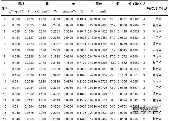 2002年11—12月長春市30個(gè)室內(nèi)樣本5項(xiàng)指標(biāo)監(jiān)測數(shù)據(jù)cj(湯紅巖等,2005),以及由式(1)和式(7)計(jì)算出的指標(biāo)規(guī)范值x′j如表 11所示.由于樣本1、11~15、26和27的不同指標(biāo)計(jì)算得到的規(guī)范值相差較大,因此,在用式(12)計(jì)算引力綜合指數(shù)時(shí),需用式(13)對引力指數(shù)值進(jìn)行加權(quán)計(jì)算,其余22個(gè)樣本的指標(biāo)視作等權(quán),計(jì)算得到各樣本引力綜合指數(shù)值,并根據(jù)表 3中空氣環(huán)境質(zhì)量引力指數(shù)分級標(biāo)準(zhǔn)做出評價(jià)結(jié)果(表 11).表中還列出文獻(xiàn)(湯紅巖等,2005)中用層次分析評價(jià)法做出的評價(jià)結(jié)果.由于文獻(xiàn)(湯紅巖等,2005)中的層次分析評價(jià)法將室內(nèi)空氣污染劃分為清潔(1*級)、未污染(2*級)、輕污染(3*級)、中污染(4*級)和重污染(5*級)等5級;而本文引力指數(shù)法將其劃分為1級、2級、3級.二者對應(yīng)關(guān)系為:(1*級清潔、2*級未污染)對應(yīng)1級,(3*級輕污染)對應(yīng)2級,(4*級中污染、5*級重污染)對應(yīng)3級.由表 11可以看出,二種方法評價(jià)結(jié)果完全一致.
