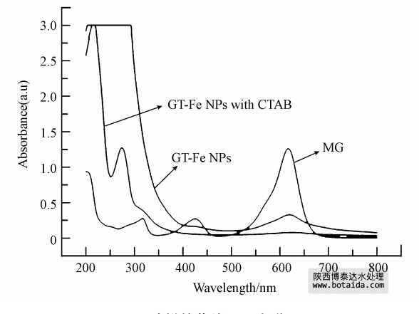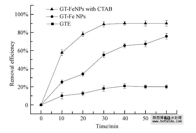 2)比較GTE、GTE合成的Fe NPs和CTAB作用下GTE合成的Fe NPs對MG的去除效果發(fā)現(xiàn),GTE對MG有一定的去除作用,30 min達到平衡時,去除率為20.03%;GTE合成的Fe NPs對MG的去除效率30 min為52.28%,反應平衡時達到75.66%;而CTAB作用下GTE合成的Fe NPs對MG的去除效率更大,30 min就達到了77.78%,反應達到平衡高達91.06%. Fe NPs是去除MG的主要物質.