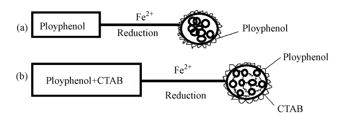 用植物提取液合成納米金屬主要是通過植物提取液中的有機成分如多酚等為還原劑還原金屬鹽,GTE中多酚可作為還原劑還原亞鐵鹽制備Fe NPs(Njagi et al., 2011; Shahwan et al., 2011; Kharissova et al., 2013; Mittal et al., 2013). GTE合成Fe NPs和CTAB作用下GTE合成Fe NPs可能的機理如圖 6所示. 陽離子表面活性劑CTAB存在時,由于CTAB吸附在納米顆粒表面導致納米鐵帶電荷,納米顆粒之間的斥力作用使得合成的納米顆粒更加分散,從SEM、XRD、FTIR和UV-vis等的表征結果也可證實CTAB的包覆使得合成的納米鐵更加穩(wěn)定.