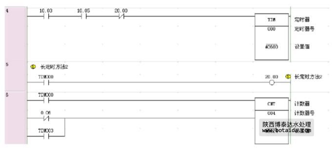 上圖是專門為自動(dòng)控制形式下的計(jì)時(shí)裝置,為長(zhǎng)定時(shí)的一種,因?yàn)門IM最多記錄可以999.9S而一般工作周期為1天所以加上CNT兩者相互配合起到長(zhǎng)定時(shí)的作用。將這段程序設(shè)置常開1003,常開1006,常閉2000,在這一段程序后面必須要設(shè)置了一個(gè)定時(shí)器,TIM000,因?yàn)橐獙⒑芏嗟奈鬯M(jìn)入到這個(gè)污水處理系統(tǒng)中來,進(jìn)入到提前設(shè)置好的罐子里,所以時(shí)間要設(shè)置的要長(zhǎng)一點(diǎn),設(shè)置為一小時(shí)已經(jīng)很充足了,這樣污水就能源源不斷的進(jìn)入到罐子里,這樣就能實(shí)現(xiàn)我事先設(shè)置的要盡可能多的將來污水進(jìn)行處理,這樣對(duì)應(yīng)用實(shí)際是很必要的,但是要是在實(shí)驗(yàn)的時(shí)候就要設(shè)置的時(shí)間短一點(diǎn),那樣就不用等待那么長(zhǎng)的時(shí)間了,實(shí)驗(yàn)的結(jié)果就很容易很輕易的一目了然了,不必等待那么長(zhǎng)的時(shí)間去看到這個(gè)污水處理系統(tǒng)所要達(dá)到的結(jié)果,這一段時(shí)間實(shí)現(xiàn)后,下面要實(shí)現(xiàn)的就是長(zhǎng)定時(shí)的方法2,設(shè)置常開點(diǎn)TIM000,在常開點(diǎn)TIM000后接上線圈2000,這一小段程序雖然在整個(gè)污水處理系統(tǒng)中起到的作用不是十分的重要,但是整套系統(tǒng)如果出現(xiàn)了什么問題,那么就必須得需要第二套程序,來讓系統(tǒng)再次正常的繼續(xù)進(jìn)行污水處理的過程.它的作用就是將這個(gè)過程設(shè)置好時(shí)間來進(jìn)行下一步驟,這也是手動(dòng)方式所必須要存在的程序,常開TIM000,這個(gè)常開TIM000就是上段的定時(shí)器,就是說上面的定時(shí)器,一旦實(shí)現(xiàn)好它的功能,那么這一段程序就開始運(yùn)行了,在常開點(diǎn)TIM000后面接上線圈2000,下一段程序就要設(shè)置好定時(shí)器,實(shí)現(xiàn)定時(shí)的功能,常開點(diǎn)TIM000,常閉0006,常開TIM003,它們后面都要接定時(shí)器CNT004,設(shè)置的時(shí)間為0024,也就是24秒,至于這個(gè)時(shí)間定時(shí)的多少都是沒有太大的關(guān)系和影響,主要的目的就是要將系統(tǒng)更多,更好,更高效的進(jìn)行污水處理,這一當(dāng)關(guān)機(jī)時(shí)或者進(jìn)入下一個(gè)工作周期CNT需要復(fù)位,所以在CNT復(fù)位端并聯(lián)上0006,TIM003,起到復(fù)位作用。