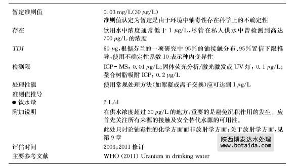 根據(jù)人群接觸高濃度鈾的新的流行病學(xué)研究推導(dǎo)的30μg /L的暫定準(zhǔn)則值,代替原先 根據(jù)實(shí)驗動物研究推導(dǎo)的暫定準(zhǔn)則值。被認(rèn)定為是基于有關(guān)鈾的毒理學(xué)和流行病學(xué)上的不 確定性以及要實(shí)現(xiàn)更低濃度供應(yīng)在技術(shù)上的困難度。要注意的是,有關(guān)人類群體的研究如 可獲取且質(zhì)優(yōu),則為用于推導(dǎo)健康準(zhǔn)則值相關(guān)信息的首選來源