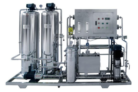 此工藝原理:原水經(jīng)過精細過濾器、顆?;钚蕴歼^濾器、活性碳過濾器等,再通過泵加壓,利用孔徑為1/10000μm的反滲透膜(RO膜),使較高濃度的水變?yōu)榈蜐舛人?同時將重金屬、細菌、病菌等大量混入水中的雜質(zhì)全部去除,從而達到飲用規(guī)定的理化指標及衛(wèi)生標準。