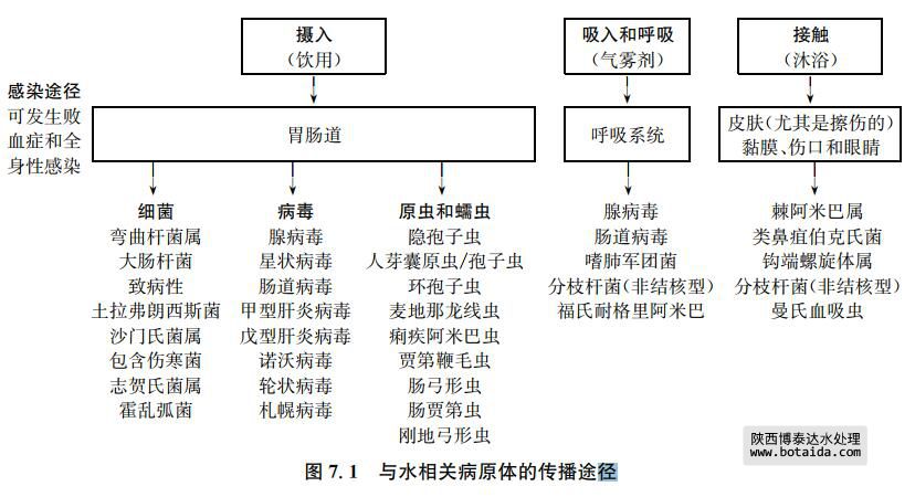 能在自然環(huán)境中存在的其他病原體可能導(dǎo)致那些易感人群引發(fā)疾病,如老人或幼兒、燒 傷或有大面積創(chuàng)傷的病人、接受免疫抑制療法或是獲得性免疫缺陷綜合癥(艾滋?。┗颊?。 如果這些人飲用或沐浴的水中含有足夠數(shù)量的這種病原體,就可引起各種皮膚和眼、耳、鼻、 喉黏膜感染。這些病原包括銅綠假單胞菌、黃桿菌屬、不動(dòng)桿菌、克雷伯氏菌、沙門氏菌、氣 單胞菌和某些“生長(zhǎng)緩慢”的非結(jié)核性分枝桿菌等(見(jiàn)附錄1支持文件《水中的病原分枝桿 菌》)。表7.2列出了一些這種生物體(更多詳細(xì)內(nèi)容請(qǐng)參見(jiàn)第11章)。