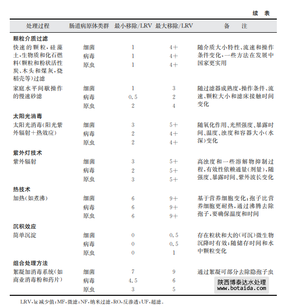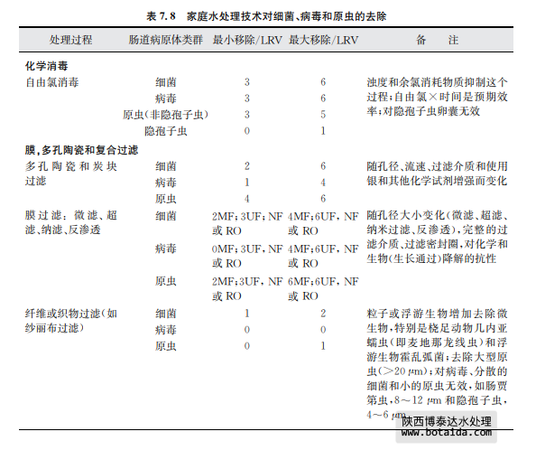 表7.8總結(jié)了采用上述幾種家庭水處理技術(shù)對水傳播細菌、病毒和寄生性原生蟲的 去除情況。這些去除信息是基于科學(xué)文獻報告的研究結(jié)果。有兩個有效性內(nèi)容:基本去 除和最大去除?;救コ侵赣上鄬Σ皇炀毴藛T實際操作時的一般運行效果,且操作人 員將以上方法用于處理平均水質(zhì)或可變水質(zhì)原水及現(xiàn)場只有很少應(yīng)用工具以優(yōu)化處理條 件和操作時。最大去除是指在熟練操作和優(yōu)化運行條件下,并且在可預(yù)見和不變水質(zhì)條 件下,有相關(guān)儀器工具支持并保持最高水平運行時達到的效果(如測試一個已知濃度和種 屬的微生物時)。應(yīng)當該注意的是某些水處理工藝的lg減少值存在差異,如表7.8中的 家庭水處理和表7.7中的集中處理。這種相同處理技術(shù)、不同的運行效果差異是可以理 解的。因為集中處理所用水通常滿足處理工藝所需要的質(zhì)量,而且處理過程由訓(xùn)練有素的操作人員使用,工藝經(jīng)過合理的設(shè)計并有良好的運行控制系統(tǒng)。相反,家庭水處理通常 水質(zhì)變化較大,也沒有得到最好的運行技術(shù)優(yōu)化。相對于管理集中處理設(shè)施的人員,處理 過程也常常得不到專業(yè)人員的專業(yè)運行控制。這些處理過程的進一步細節(jié),包括運行影 響因子和表7.8中提供的lg減少值水平基礎(chǔ),可見附錄1支持性文件《家庭水管理和家庭 水處理選擇評估》。陜西博泰達水處理為您提供服務(wù)。
