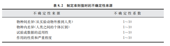 涉及一般人群的接觸劑量時(shí),以動(dòng)物實(shí)驗(yàn)臨界效應(yīng)得出的犖犗犃犈犔或犅?tīng)蜖模癄聽(tīng)蜖臓掏?常要除以不確定性系數(shù)100。這里還有兩個(gè)10倍系數(shù),其一是物種間差異,另一個(gè)是人群中 個(gè)體間差異(見(jiàn)表8.2)。另外的不確定性系數(shù)還可能來(lái)自數(shù)據(jù)資料的不足和有害作用的嚴(yán) 重性和不可逆性。