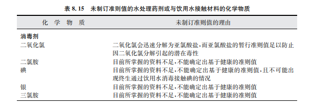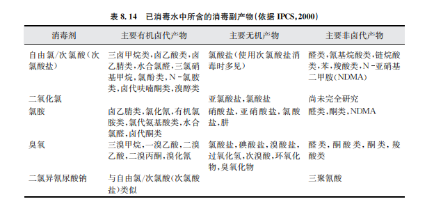在水處理過程中,有些物質(zhì)是人為添加進(jìn)入水體的(直接添加物),有些物質(zhì)可能不受控 制地殘留在出水中(如鹽類、高分子絮凝劑殘留物或單體)。類似氯胺或自由氯的殘留屬于 有意添加,這些殘留對(duì)水質(zhì)保障有一定好處。其他物質(zhì),如消毒副產(chǎn)物,是在消毒劑與水中 通常存在的一些物質(zhì)相互起化學(xué)反應(yīng)過程中產(chǎn)生的(見表8.14)。氯化消毒副產(chǎn)物和其他消 毒副產(chǎn)物也可能會(huì)在游泳池用水中出現(xiàn),此時(shí)吸入和皮膚吸收途徑對(duì)人體接觸消毒副產(chǎn)物 更加重要(WHO,2006)。