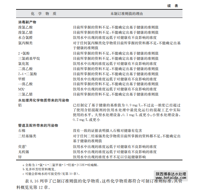 其他化學(xué)物質(zhì),如來自管道或銅質(zhì)龍頭的鉛或銅,以及從涂層溶出的化學(xué)物,可能是在 處理或輸配水過程中因水與其表面接觸而進(jìn)入水中(間接添加物)。 飲用水處理中使用的一些化學(xué)物質(zhì)(如鋁)或可能與水接觸的一些化學(xué)材料(如苯乙烯) 也許會(huì)從其他主要來源進(jìn)入水中,這些已在本章其他章節(jié)具體討論。