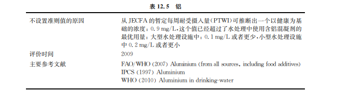 盡管鋁廣泛存在于食物、飲用水及抗酸劑中,很少有跡象表明經(jīng)口攝入鋁會(huì)引起人急性 中毒。有一種假設(shè)認(rèn)為鋁的攝入會(huì)增加人類老年癡呆癥發(fā)病風(fēng)險(xiǎn)。1997年 WHO發(fā)布的 環(huán)境健康標(biāo)準(zhǔn)中對(duì)鋁作出規(guī)定(見表12.5)。