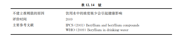 由于鈹非常罕見,如果曾經(jīng)出現(xiàn)過在飲用水中發(fā)現(xiàn)了有危害的濃度,也沒必要為它建立 一個(gè)正式的飲用水準(zhǔn)則。 以一個(gè)長(zhǎng)期的關(guān)于犬類的小腸損傷的研究作為毒性終點(diǎn),假設(shè)飲用水犜犇犐配額取 20%,一個(gè)體重60kg的成年人每天飲用2L水,犜犇犐?。?mu;g/kgbw可計(jì)算出飲用水中鈹?shù)慕】禈?biāo)準(zhǔn)為12μg/L。這個(gè)分配定額可能是保守的,因?yàn)閬碓从谑澄锝佑|的有限數(shù)據(jù)表明此 來源可能遠(yuǎn)低于犜犇犐值。 盡管鈹似乎在飲用水源和飲用水中存在濃度都很低,水中濃度的數(shù)據(jù)有限,但也會(huì)存在 可能的特殊情況,自然條件中pH值低于5或者高于8或者高濁度的情況下鈹濃度會(huì)有所 升高。
