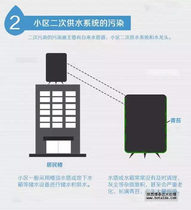 小區(qū)一般采用樓頂水塔或地下水箱等儲水設(shè)備進(jìn)行儲水和供水。而水塔或水箱常常沒有及時清理,灰塵等雜質(zhì)堆積。有的儲水設(shè)備甚至?xí)?yán)重老化、長滿青苔,產(chǎn)生大量細(xì)菌滋生。