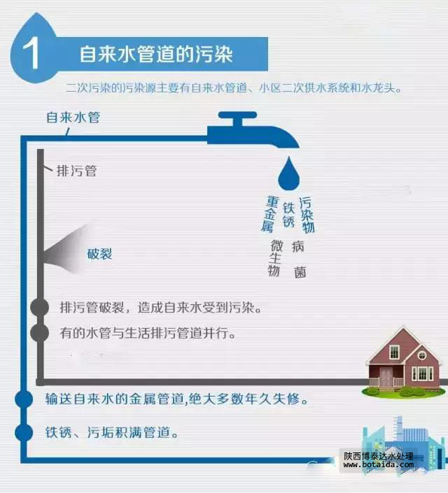 顧名思義,二次污染是指水源經(jīng)自來水廠凈化處理后,在輸送到各家各戶的過程中產(chǎn)生的污染。主要是一些水管老化出現(xiàn)的鐵銹、泥沙、細(xì)菌、病毒等雜質(zhì)和自來水廠氯制劑消毒后的副產(chǎn)物。二次污染的污染源主要有自來水管道、小區(qū)二次供水系統(tǒng)和水龍頭。