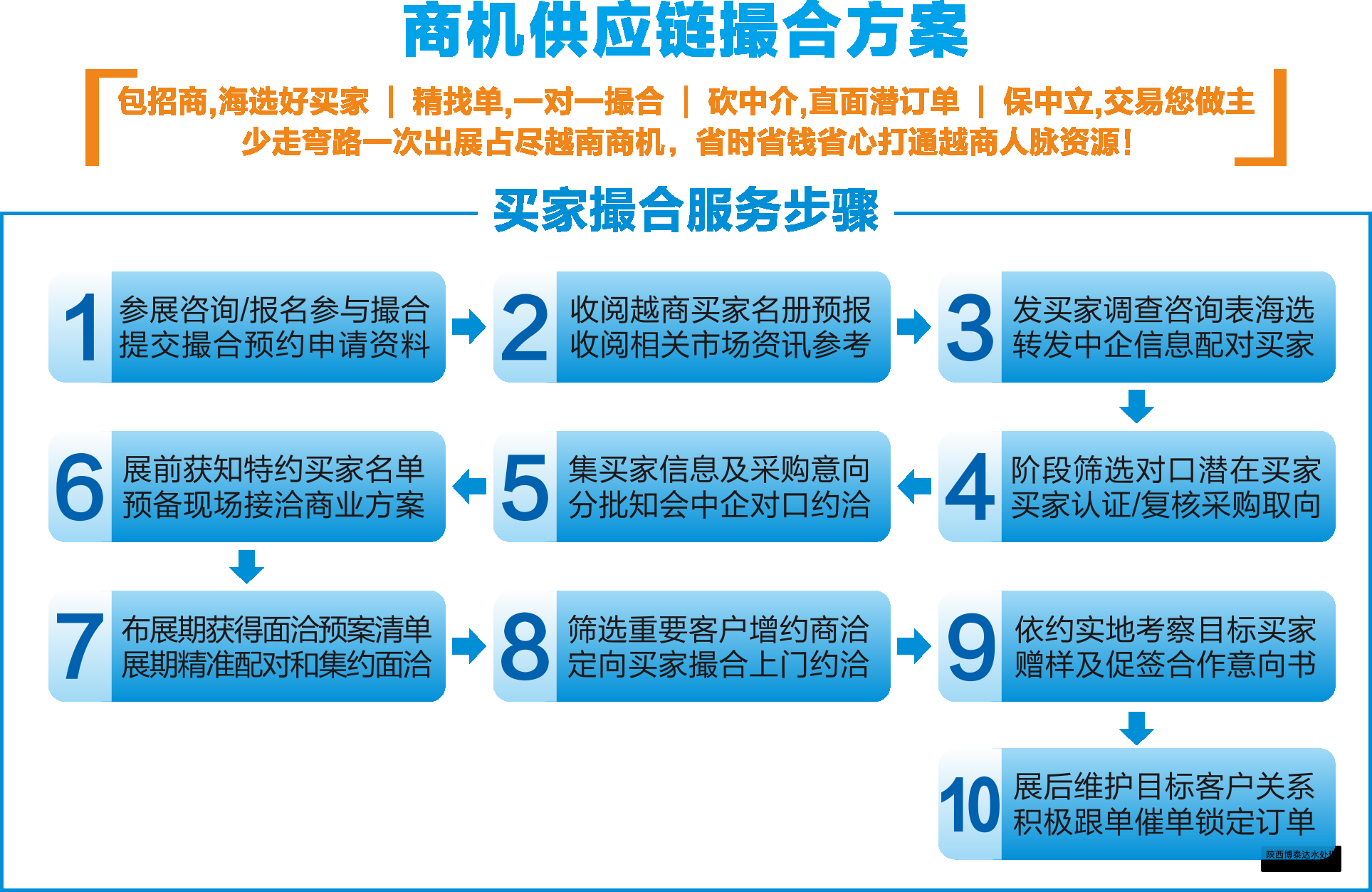 可量身定制買家撮合對接服務(wù),獨(dú)享個性化行程:上門拜訪客戶、實(shí)地考察、商協(xié)會接洽等,費(fèi)用另