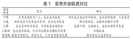 常用的外加碳源有甲醇、乙酸、酒業(yè)廢水、乙酸鹽、淀粉、葡萄糖和食品加工廢水等。表1所示常見(jiàn)的外加碳源的對(duì)比效果: