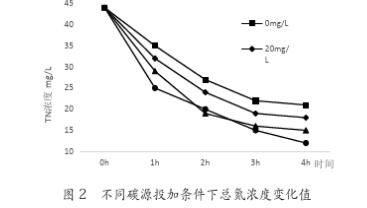 如圖2表示,葡萄糖作為外加碳源,在投加量分別為0、20mg/L、40mg/L和80mg/L情況下,總氮隨時(shí)間的變化值??偟S反應(yīng)時(shí)間的延長(zhǎng),濃度逐漸降低,最終出水濃度分別為21mg/L、18mg/L、15mg/L和12mg/L。在投加碳源后,系統(tǒng)對(duì)脫氮的效果有所提升,對(duì)總氮的去除率分別為52%、59%、66%和73%。投加碳源達(dá)到20mg/L后出水滿足《城鎮(zhèn)污水處理廠污染物排放標(biāo)準(zhǔn)》GB18918-2002中的一級(jí)B標(biāo)準(zhǔn),而且隨著投加量的增加,系統(tǒng)對(duì)總氮的處理效果增強(qiáng)。實(shí)驗(yàn)表明:碳源的投加,保證了硝化細(xì)菌,特別是異養(yǎng)型反硝化細(xì)菌對(duì)碳源的需求,提高的脫氮的效果。