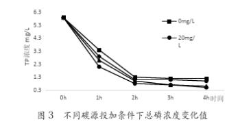 如圖3表示,葡萄糖作為外加碳源,在投加量分別為0、20mg/L、40mg/L和80mg/L情況下,總磷隨時(shí)間的變化值??偭纂S反應(yīng)時(shí)間的延長(zhǎng),濃度逐漸降低,最終出水濃度分別為1.2mg/L、1.0mg/L、0.6mg/L和0.5mg/L。在投加碳源后,系統(tǒng)對(duì)除磷的效果有所提升,對(duì)總磷的去除率分別為80%、83%、90%和92%。投加碳源達(dá)到20mg/L后,出水均滿足一級(jí)B標(biāo)準(zhǔn),而且隨著投加量的增加,系統(tǒng)對(duì)總磷的處理效果增強(qiáng)。