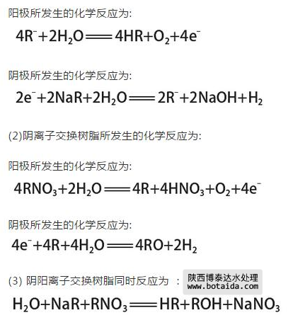 在利用滲析的極化過(guò)程中,由于在水溶液中會(huì)產(chǎn)生H+和OH-,使樹脂在化學(xué)反應(yīng)中進(jìn)行電化學(xué)再生,這對(duì)水質(zhì)的提升具有正面的影響,而在再生的過(guò)程中,如果不進(jìn)行離子交換處理,就會(huì)造成水質(zhì)變壞,這樣就需要采用適宜的工作環(huán)境,才能達(dá)到提高水質(zhì)的要求,采用EDI裝置的離子交換樹脂技術(shù),可以有效的提高水質(zhì)。具體的化學(xué)反應(yīng)方程式如下,