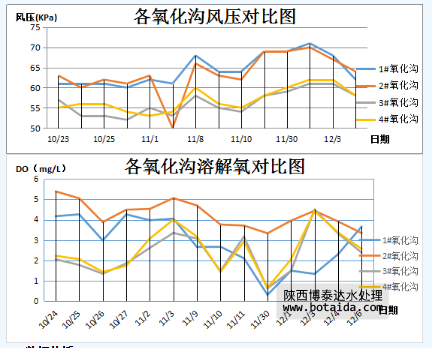 旋流曝氣器會(huì)卷吸起底部的泥水混合物,旋流曝氣器會(huì)將藏在底部污泥中的部分有機(jī)物進(jìn)一步消化分解,故在運(yùn)行初期,旋流曝氣器產(chǎn)生的一部分溶解氧用來(lái)消解底部的污泥。故在運(yùn)行初期,安裝旋流曝氣器的3#、4#氧化溝溶解氧不高。隨著旋流曝氣器的穩(wěn)定運(yùn)行,池底堆積的污泥進(jìn)一步消解,氧化溝中額溶解氧進(jìn)一步上升。博泰達(dá)預(yù)測(cè),在未來(lái)數(shù)月內(nèi),3#、4#氧化溝內(nèi)的溶解氧會(huì)繼續(xù)上升,直至底部污泥消解殆盡。