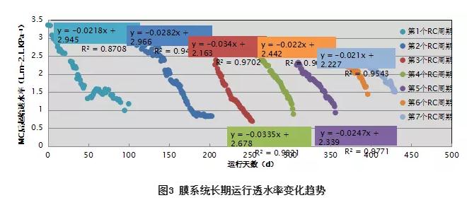 ① 透水率穩(wěn)定性透水率(J25/△P)是衡量膜滲透性能的主要指標(biāo)。以透水率隨運(yùn)行時(shí)間的衰減速率作為膜系統(tǒng)運(yùn)行穩(wěn)定性的評(píng)價(jià)指標(biāo),方法是:通過線性擬合分析得到每次維護(hù)性清洗(MC)后的起始透水率,再將每個(gè)恢復(fù)性清洗(RC)周期內(nèi)的起始透水率進(jìn)行線性回歸得到每個(gè)RC周期內(nèi)的透水率衰減速率,見圖3。