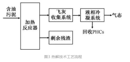 在無氧條件下,含油污泥經(jīng)高溫熱解轉(zhuǎn)化為氣、液、固三相,氣相產(chǎn)品以CH4、CO2、H2和CO為主,液相一般為常溫燃油和水,固相殘渣中含有焦炭,一般以回收液態(tài)PHCs為主,可不調(diào)質(zhì)達到回收目的。熱解反應在還原氣氛下進行,產(chǎn)二噁英極少,其典型工藝流程如圖3所示。
