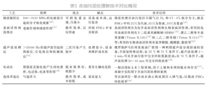 其他技術(shù)主要包括微波輻射法、表面活性劑洗滌法、超聲波處理法、電動法、泡沫浮選法等,尚處于實驗室研究階段,具體對比情況見表1。